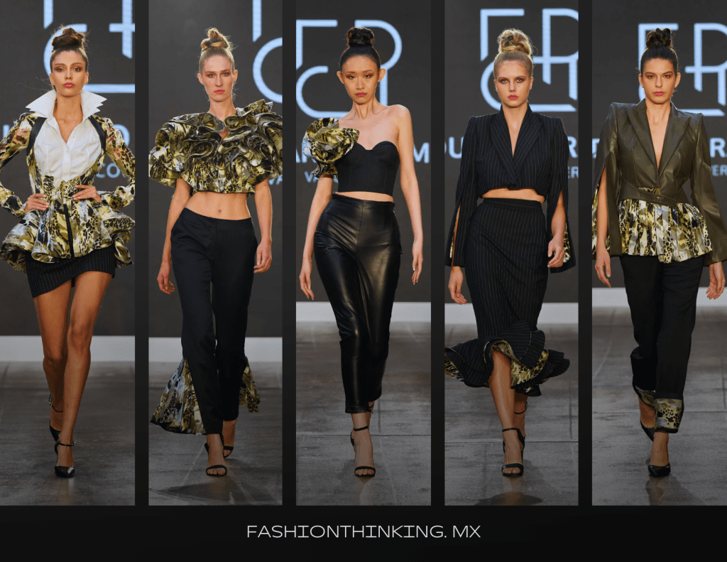 Sastrería, cuero, estampados y volumen crearon una metáfora en esta colección inspirada en el viaje de la mariposa Monarca, la cual conecta con la vivencia personal de este diseñador mexicano-canadiense como una persona inmigrante. Eduardo Ramos, plasmó en sus prendas el simbolismo de la transformación y la resiliencia a través de materiales y formas. El contraste entre la delicadeza de la seda con la audacia y fortaleza del cuero, crearon una narrativa perfecta a través de la ropa. Contando así, una historia sensible y esperanzada del duro proceso de transformación para lograr objetivo mayor, algo que podemos ver tanto en la naturaleza como en la experiencia de vida humana.