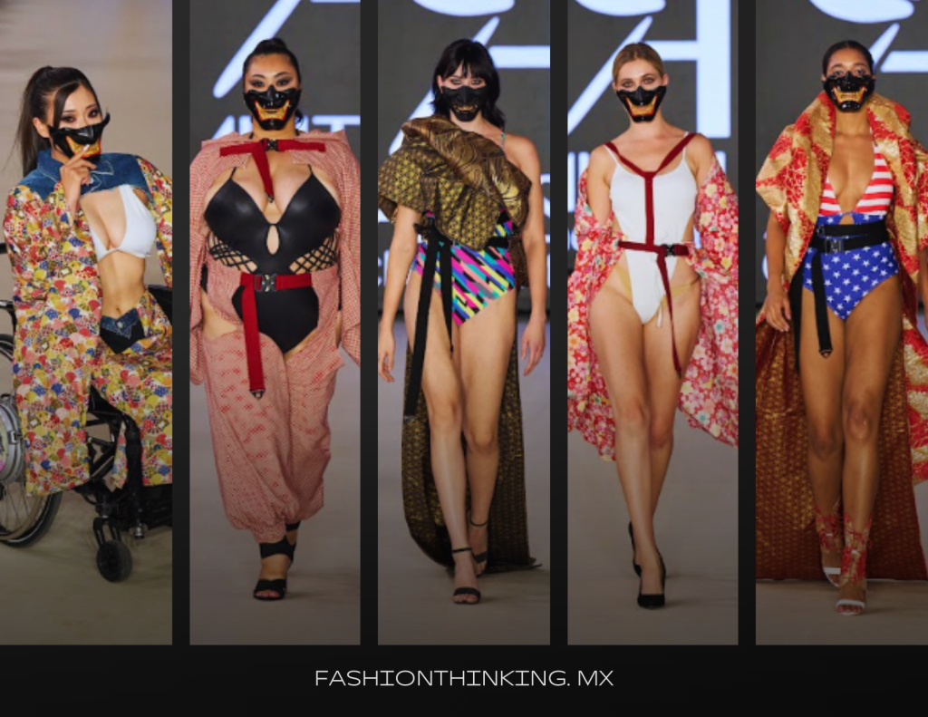 La esencia de Japón y oriente se reflejó vivamente en la colección de Chemi Akutami para su marca Akitsu, con la que presentó diseños que muestran la tradicionalidad a través de los textiles, estampados y elementos de la cultura pop moderna de su país. Pero no solo se trató de tradicionalidad, también mostró en sus prendas la influencia de otras culturas que lo llaman e inspiran. Chemi decidió integrar en esta pasarela su posición a favor de la inclusividad y diversidad a través de las mujeres que vistió.