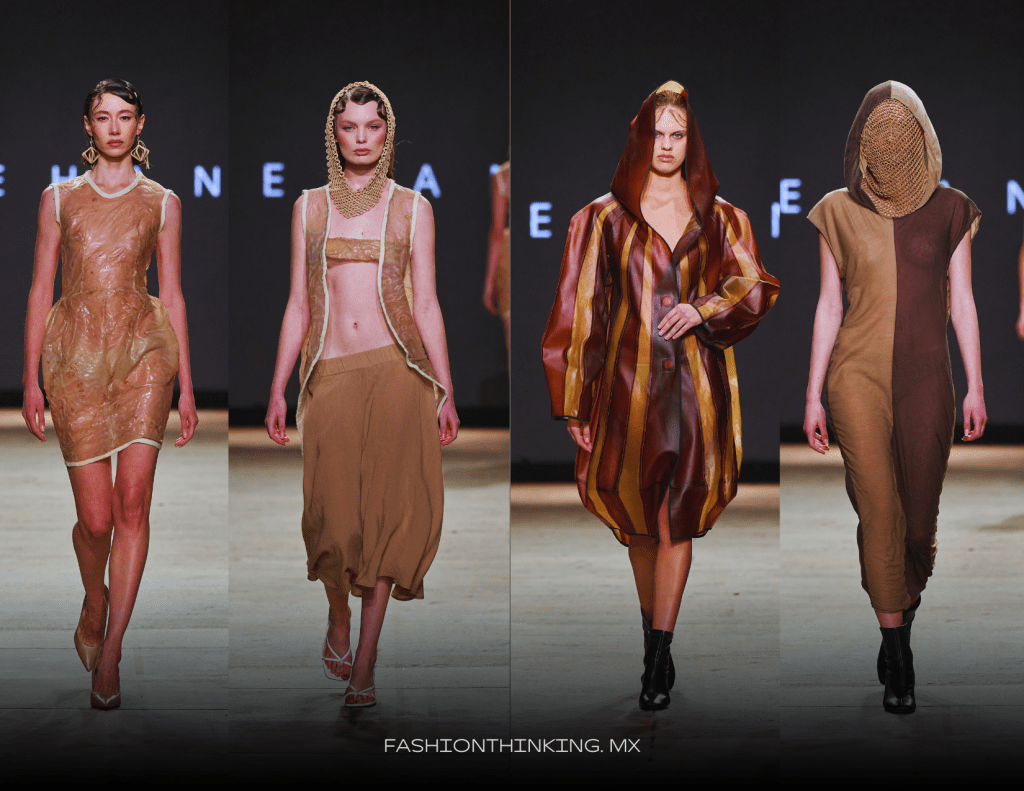 Kehang fusionó materiales como el lino, algodón, organza, cuero y elementos como la silicona, lo que permitió explorar contrastes únicos en textura y estructura. La dualidad fue el eje central de la propuesta, contrastando la suavidad con la fuerza durante la colección. Cortes innovadores, estructuras fluidas, capuchas, tejidos y formas experimentales se expusieron en una paleta neutra de tonos terrosos, grises y beiges durante su presentación.
