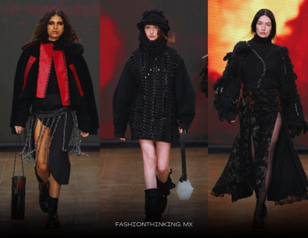 En su colección, “Outraged”, Tara Kari busca reflejar emociones reprimidas e intensas que se originan desde la cotidianidad de la presión del día a día de la vida moderna y las expectativas impuestas por la sociedad. Un estallido emocional que no se contiene y da paso a una liberación, se evoca a través de capas texturizadas que contrastan con materiales rígidos en tonos profundos y excitantes como el rojo, nude y negro. “Outraged” trajo a la pasarela la furia y la ansiedad reprimida que representa la era actual, así como el ansia de liberación y autenticidad de toda una generación.