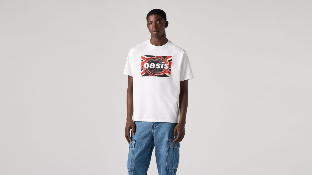 As part of its Band Tee Collection, Levi’s launched in 2024 a commemorative collection for the 30th anniversary of Oasis’s album Definitely Maybe and their new tour, reviving the original Decca logo and the Union Jack logo that take us back to the 90s.
